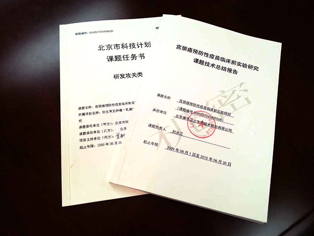 2015年8月14日,康乐卫士中标项目《宫颈癌预防性疫苗临床前实验研究》在北京市科委的组织下,完成了结题答辩。答辩会上,多位专家听取课题负责人关于项目的结题汇报,按照课题考核指标要求,公司完成“重组三价人乳头瘤病毒(16/18/58型)疫苗(大肠杆菌)”的临床前研究,向国家药监局进行了疫苗临床试验注册申请,并获得受理。在课题执行期获得授权发明专利1项,极大的丰富了生物制药的研究内容和手段,促进了北京市的生物制药产业发展及带动高科技产业结构的调整,与会专家均给出“同意验收合格”的意见。据此,此课题圆满通过结题验收。