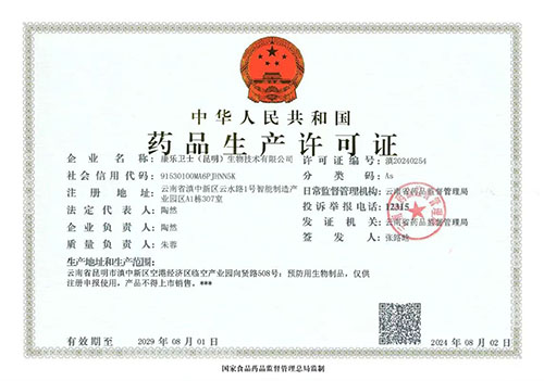 近日,北京康乐卫士生物技术股份有限公司(下简称“康乐卫士”)全资子公司康乐卫士(昆明)生物技术有限公司(下简称“康乐卫士(昆明)”)获得云南省药品监督管理局颁发的《药品生产许可证》。此次获得《药品生产许可证》标志康乐卫士由生物医药研发向商业化转型迈出重要一步。