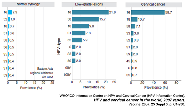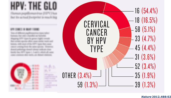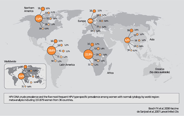 IARC发起世界范围内22个国家在内的1000个组织学确认的浸润型宫颈癌病例中HPV病毒检测的调查,发现99.7%的宫颈癌呈现HPV-DNA阳性,表明HPV是诱发宫颈癌的必要因素。目前已经确认,HPV可以引起宫颈癌、阴茎癌、外阴癌、阴道癌、肛门癌和口咽癌(食管癌)等六种恶性肿瘤。2008年全球1270万恶性肿瘤新发病例的4.8%是由HPV感染引起的;即HPV感染引起的年新发癌症为61万例,其中宫颈癌为53万例(86.9%),其它五种癌症为8万例。