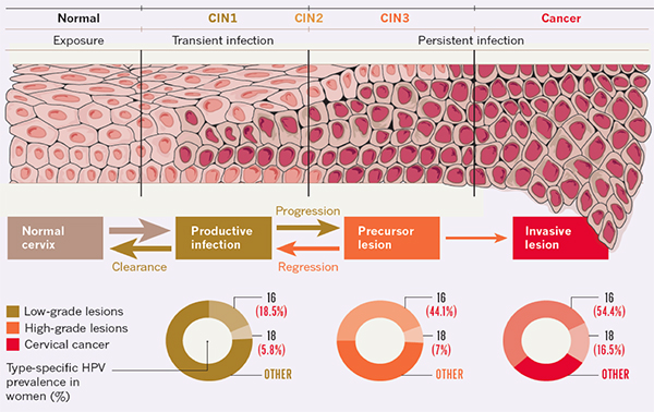 2008年诺贝尔医学奖获得者zur Hausen,在1983年首次以实验证据阐明人乳头瘤病毒是诱发宫颈癌的病因。HPV感染宿主上皮细胞后,可以导致宿主基因组的不稳定和不可逆的改变。HPV感染初期,在基底层上皮细胞中通常以环状的附加体DNA形式存在(episomal DNA),即不整合进入宿主基因组;然而宿主细胞被HPV转化后,病毒DNA通常随机整合进宿主基因组DNA,其致癌基因E6和E7通常保持完整状态,并持续高水平表达。研究证明,高危型HPV的E6和E7分别通过降解抑癌基因p53和pRb导致宫颈癌的发生。